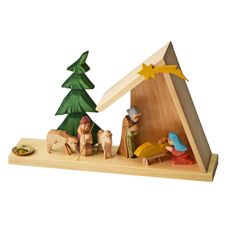 Ein kleiner Kerzenhalter mit geschnitzten klassischen Krippenmotiv. Der Lichthalter ist für Kerzen mit einem Durchmesser von 14 mm ausgelegt. Neben der Heiligen Familie im Stall ist auch noch ein Schäfer mit seinen beiden Schafen unter einem Baum abgebildet.