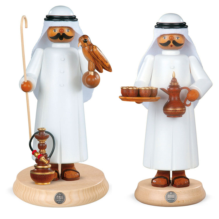 Araber mit der Kaffeekanne und dem Tablett oder der Araber mit Falke und Shisha. Zwei sehr stark beeindruckende Räuchermännchen in dem traditionellen arabischen Gewand. Beide Räuchermännchen sind von der Firma Müller aus Seiffen produziert.