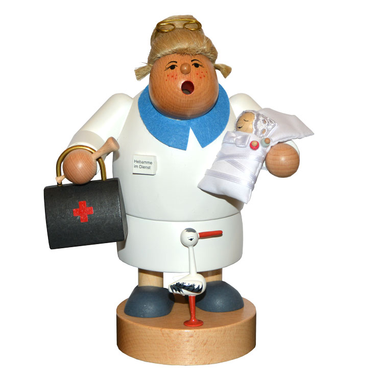 Bei dieser Hebamme würde sich wohl jede Mutter mit ihrem Kind gut aufgehoben fühlen. Sie steht mit beiden Beinen fest auf dem Boden und strahlt fachliche Kompetenz und Selbstsicherheit aus. Das Baby schlummert zufrieden in ihrem Arm.