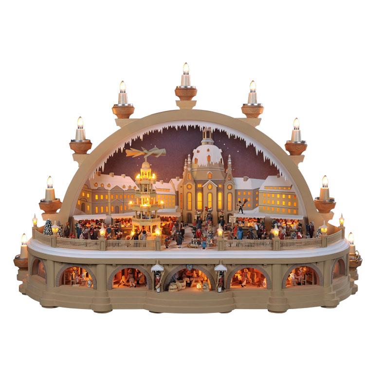 Einer der vier schönsten Schwibbogen die jemals im Erzgebirge hergestellt wurden. Diese 2. Auflage ist eine Darstellung des Dresdner Striezelmarktes zwischen Vergangenheit und Gegenwart. Darauf zu sehen ist eine beleuchtete Pyramide, detailgetreue Straßenlaternen, sowie ein Bildnis von Ludwig Richter „Ausverkauf wegen Geschäftsaufgabe“. Im beleuchteten mechanisch beweglichen Sockel wird die Entstehung des Porzellans durch Johann Friedrich Böttger (1682-1719) und Ehrenfried Walther von Tschirnhaus (1651-1708) bis hin zur Bemalung detailliert aufgezeigt. Sie können diesen schönen Schwibbogen zur Zeit im Erzgebirgsladen im Levantehaus live erleben. Ein Besuch lohnt sich auf alle Fälle.