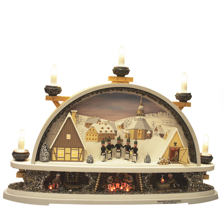 Dieser Schwibbogen zeigt die gesamte Tradition aus dem Erzgebirge. Zuerst haben die Menschen im Erzgebirge in den Bergwerken das Erz gefördert. Im oberen Teil des Schwibbogen ist die Landschaft von Seiffen dargestellt wo jetzt die Erzgebirgler das Spielzeug und die erzgebirgischen Erzeugnisse wie auch Schwibbögen herstellen.