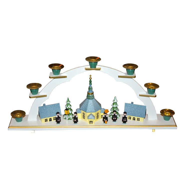 Ein Schwibbogen von ca. 45 cm Breite. Er ist weiß lackiert. Die farbige Kurrende mit den Sängern, der Seiffener Kirche und den Häusern unterhalb des Bogens runden das Gesamtbild harmonisch ab. Die sieben Kerzenhalter sind für Pyramidenkerzen mit einem Durchmesser von 14 mm vorgesehen.