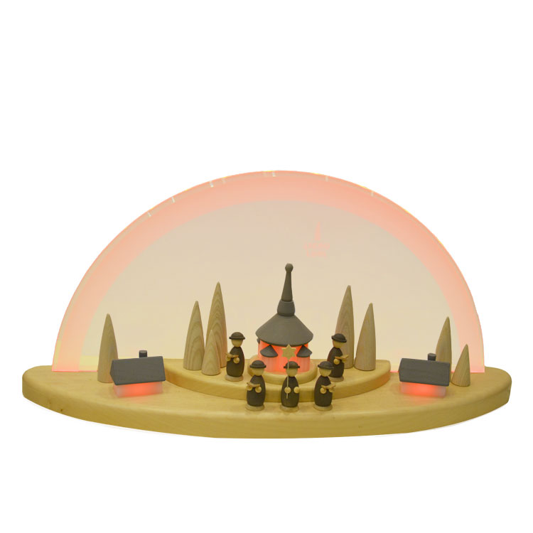 Schwibbogen mit der Darstellung der Seiffener Kirche und den Kurrende Sängern. Der Schwibbogen ist mit elektrischen Kerzen bestückt.