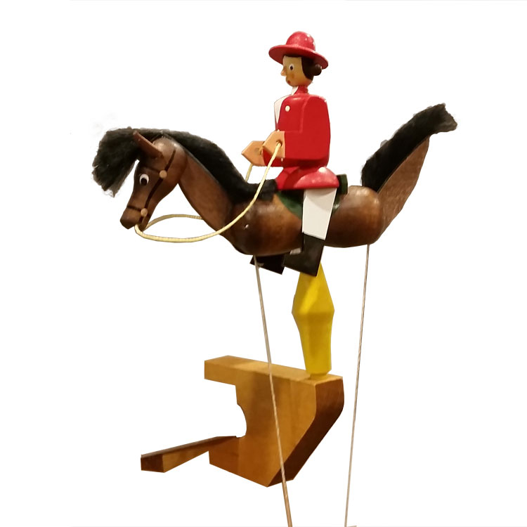 Ein Reitersmann auf Rädern. Durch die zwei kleinen Hölzer die vom Pferd zu den beiden Rädern angebracht sind wird der Schwanz und der Kopf des Pferdes beim Ziehen nach oben und unten bewegt. So entsteht der Eindruck, dass der Reiter auf seinem Pferd reitet.