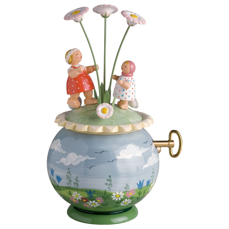 Diese kleine Spieldose ist mit einem 18 stimmigen Spielwerk ausgestattet. Sehr schön kann diese Spieldose auch mit den Blumenkindern der Firma Wendt und Kühn dekoriert werden.