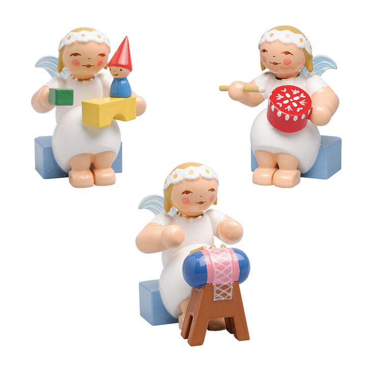 Die neuen Margeritenengel aus dem Jahr 2016 sind die kleinen sitzenden Engel mit Bausteinen, Klöppelsack und der bemalten Spandose.