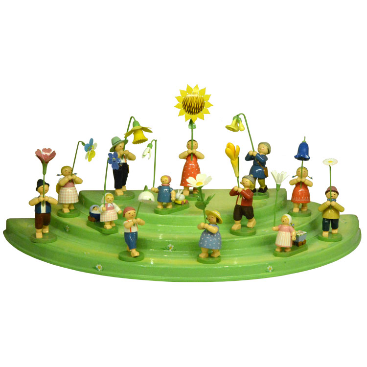 Die Blumenkinder von der Firma Wendt & Kühn sind sehr beliebt. Ob das Mädchen mit dem Stiefmütterchen, die Sonnenblume hier ganz oben auf der Treppe, der Junge mit dem Krokus aus dem Jahr 2014 oder die beiden Kleinen mit Puppenwagen oder dem Blumenwagen. Alle Blumenkinder mit ihren Blumen sind nett anzuschauen. Hier dekoriert auf der grünen Frühlingstreppe von Wendt & Kühn.