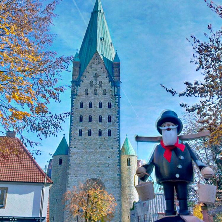 Der Dom zu Paderborn hat eine Höhe von 93 Meter und ist die Kathedralkirche des Erzbistums Paderborn und liegt im Zentrum der Paderborner Innenstadt oberhalb der Paderquellen. Aus diesen Quellen entspringt der kürzeste Fluss Deutschland mit vier Kilometer Länge "Die Pader" . Im Vergleich ist die Elbe etwa 1094 km lang.