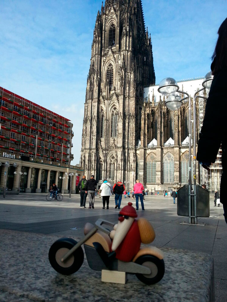Etwas verspätet oder schon wieder unterwegs der Weihnachtsmann auf seinem Motorrad in Köln. Vielleicht sucht er schon die neuen Geschenke für das Jahr 2016 oder er macht wirklich mal Urlaub. Gestartet ist er auf alle Fälle im Erzgebirgsladen im Levantehaus in Hamburg.